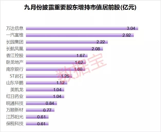 同时,也有一批个股获重要股东增持。证券时报·数据宝统计显示,九月份以来,截至最新收盘日(9月27日),共有111股披露重要股东增持进展,累计增持市值合计31.05亿元。从行业来看,轻工制造、银行及医药生物行业、机械设备行业股票数量较多,均超过9只。计算机、房地产、汽车及电气设备行业获增持市值均超过3亿元,其中计算机行业获增持市值较高,达到4.31亿元。