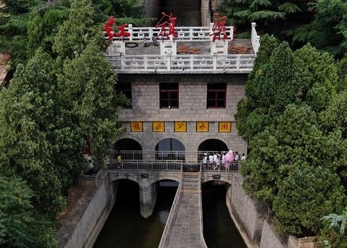 游客在河南林州红旗渠分水闸参观(7月4日无人机拍摄)。新华社记者 李安 摄