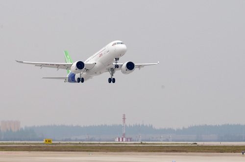 国产大型客机C919在上海浦东国际机场首飞成功(2017年5月5日摄)。新华社记者 丁汀 摄
