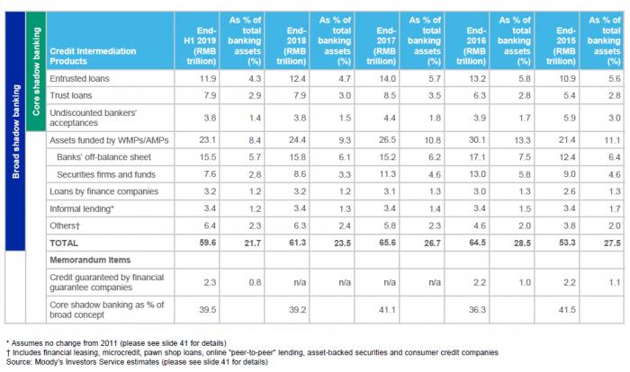 评级公司穆迪(Moody's)发布的数据显示,截至2019年6月末,广义影子银行(Shadow Banking)资产缩减近1.7万亿元,至59.6万亿元,是2016年底以来的最低水平。广义影子银行资产占名义GDP的比例从2018年末的68%降至64%,较2016年末87%的峰值降低了23个百分点。