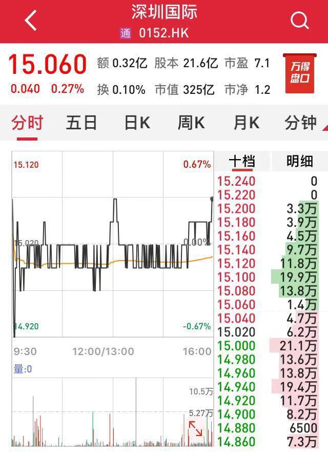 9月30日,截至收盘,深圳国际(00152.HK)报15.06港元,涨0.27%。