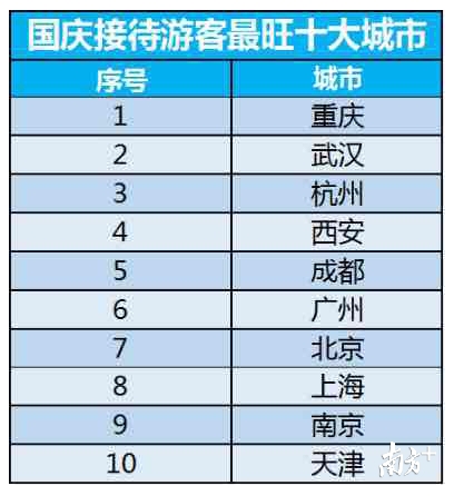 根据往年国庆游客接待数据,结合在线搜索预订人气,携程旅游大数据实验室预计,从接待人数看,今年“国庆旅游接待人气最旺十大城市”预计是:重庆、武汉、杭州、西安、成都、广州、北京、上海、南京、天津。重庆去年国庆接待游客超过3000万人次,今年有望继续成为接待游客量最多的城市。
