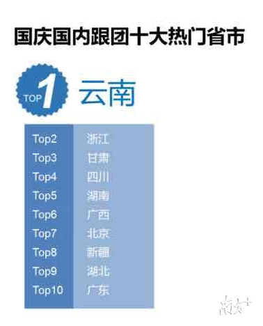 国庆跨省旅游,具备独特自然或文化特色的目的地最火。从携程数万条国内跟团游产品的搜索预订看,“国庆十大跟团游目的地”是:云南、浙江、甘肃、四川、湖南、广西、北京、新疆、湖北、广东。今年的大热点北方线路,包括敦煌、乌鲁木齐、吐鲁番、呼伦贝尔等,正处于最佳旅游季节。以昆明大理丽江线路主打的云南依然是今年国内旅游的热门,九寨沟的回归成为国庆旅游的黑马。