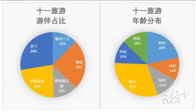 根据携程跟团游和自由行数据,十一游客中,80后人数最多,占比达到31%,90后排名第二,达到了22%。00后占比11%,也就是说,从报名携程国内游的人数看,三分之一是30岁以下的年轻一族。60、50后人群也不甘落后,占了国庆旅游人数的四分之一。