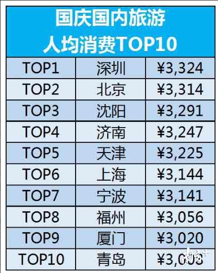 根据携程跟团游和自由行产品的数据,从包括交通、住宿、景点等在内的打包线路看,预计国庆国内跨省旅游人均花费超过3000元,深圳、北京、沈阳、济南、天津、上海、宁波、福州、厦门和青岛成为最舍得花钱的城市,单次国内游人均花费超过3000元。
