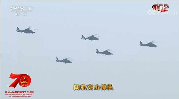 空中护旗梯队拉开了阅兵分列式的序幕。20架直升机组成巨大的“70”字样。
