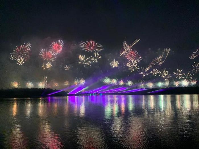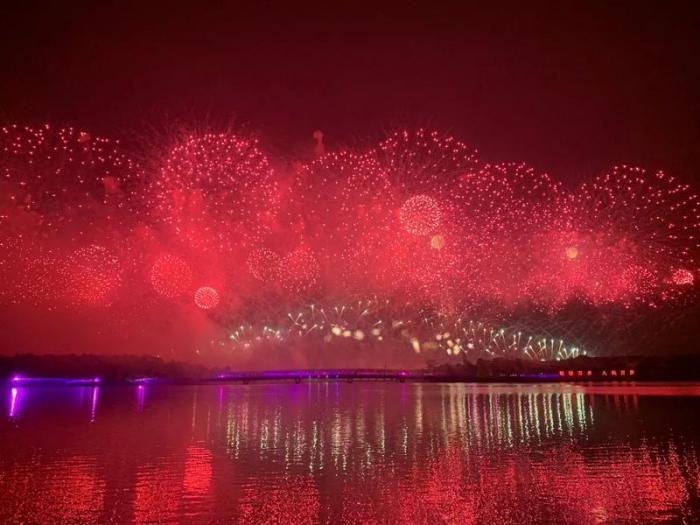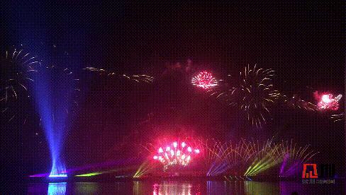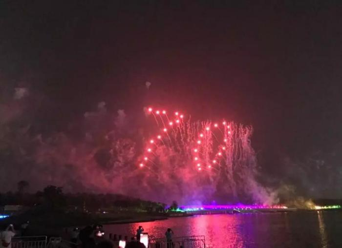 随着倒计时开始,晚上8时,烟花腾空,人才公园周边楼宇齐齐亮灯,一束激光点亮晚会现场,随着序曲《我和我的祖国》的优美乐声焰火晚会拉开了序幕。