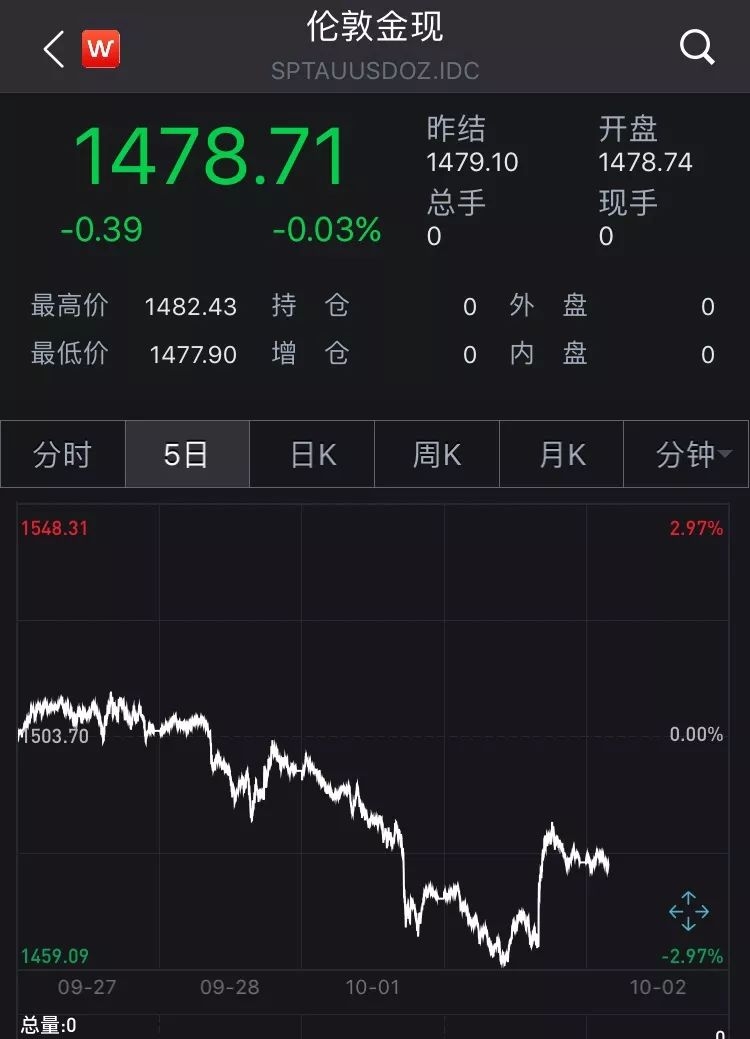 9月30日即周一,现货黄金大幅走跌。美市盘中出现跳水,金价直线坠落,最低下探至1463.99美元/盎司,触及7周低位,之后多头上攻,缩减部分跌幅后,终收于1471.93美元/盎司的低位。当日美元指数继续刷新2017年5月12日以来高位至99.59,同时全球股票价格周二小幅上扬。