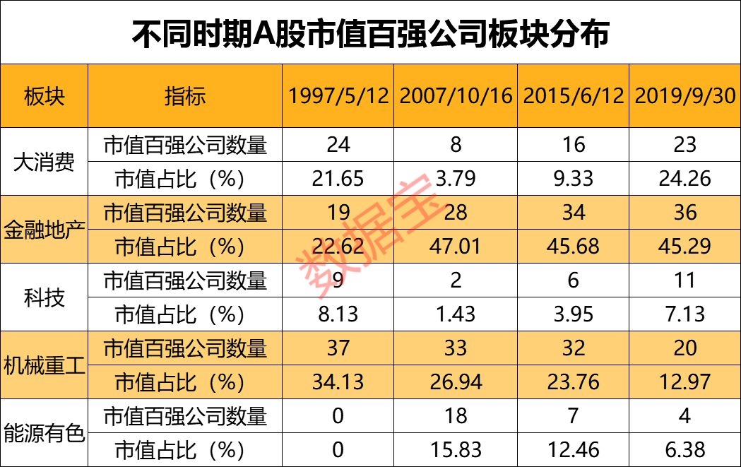 数据宝选取上证指数在不同时期的阶段性高点为研究时点,大致勾勒出A股市值龙头的变动轨迹。