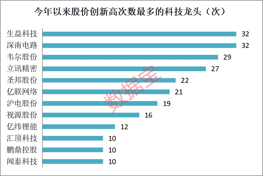 今年下半年科技股行情持续发酵,科技龙头中诞生了一批翻倍牛股。数据宝统计显示,剔除上市不足一年的个股,23只科技龙头股年初至今股价翻倍,12只科技龙头股年内股价创10次以上历史新高,PCB龙头生益科技和深南电路年内创新高次数超过30次。股价频繁创新高的科技股多身披华为、5G、芯片等热门概念。