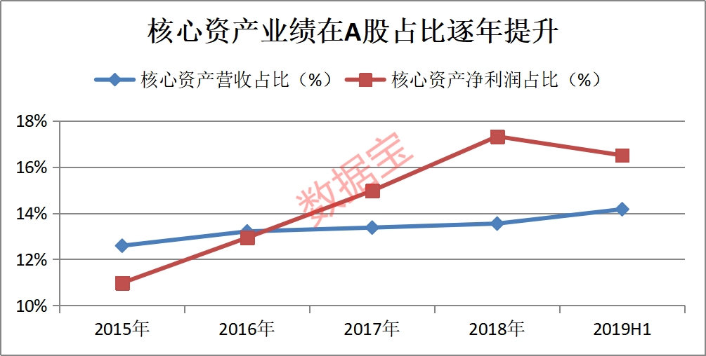 核心资产市值集中度的提升主要来源于盈利增长。2015至2018年,核心资产的营业收入由4万亿元增至6.3万亿元,增幅达56%。2019年上半年数据宝50只核心资产累计实现营业收入3.33万亿元,占A股总营收比重的14.17%,归属于母公司净利润3534亿元,占A股整体净利润的16.5%。核心资产盈利占A股的比重整体呈逐年上升的趋势。