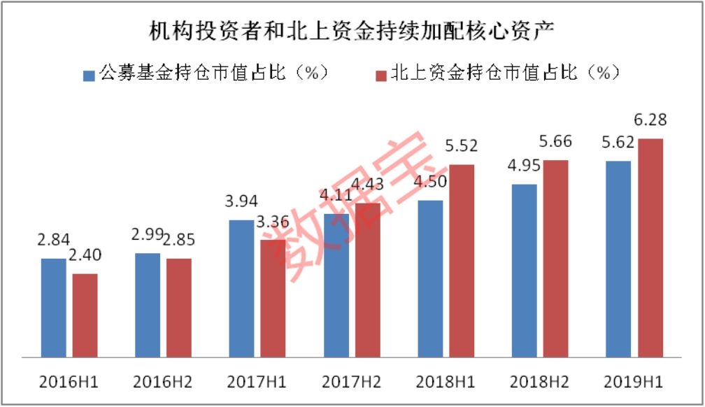 过去三年核心资产也迎来了公募基金的连续大手笔加仓。2019年上半年核心资产总市值中公募基金持仓占比5.62%,较三年前高出近一倍,远高于同期股票型公募基金净值的增速43%。