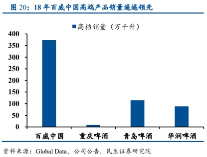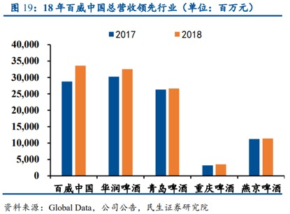 从三巨头在中国市场的排名来看,百威在销量方面低于华润和青啤,排名第三,但凭借领先华润和青啤的吨价,在总营收方面,百威于2018年跃居全行业第一。成就这一点的,正是百威在中国高端啤酒市场的绝对领先地位。