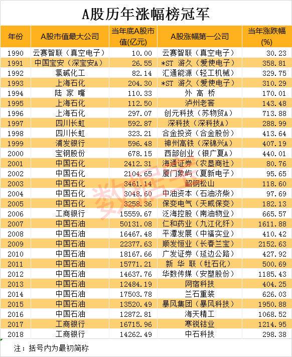 历史以来,先后有包括云赛智联(原“真空电子”)、汇通能源(原“轻工机械”)、外高桥、泸州老窖、创元科技(原“苏物贸A”)、深科技(原“深科技A”)、合金投资(原“合金股份”)登顶A股年度涨幅榜。即便在1994年、2001年、2008年、2011年、2018年等沪指跌幅超过20%的年份,A股市场牛股依然层出不穷。2008年沪指跌幅达到65.39%,当年涨幅榜冠军平潭发展累计涨幅4倍以上,平潭发展前身为“中福实业”, 2008年4月18日,由SST昌源“变身”而来的ST中福恢复交易,股价当天即狂涨1164.71%。去年沪指累计跌幅24.59%,涨幅榜冠军中石科技累计涨幅2.98倍。