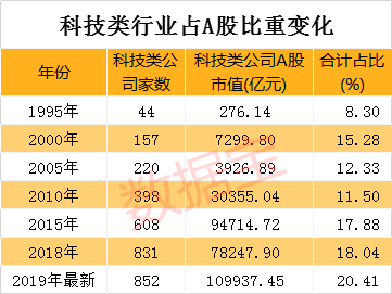 到了2010年底,新兴产业开始在资本市场崭露头角,以电子、通信、计算机、医药生物为主的科技类行业上市公司数量达到近400家,当年新上市的科技类企业合计接近百家。近几年来,从三六零、完美世界、分众传媒借壳回归,到工业富联快节奏IPO上市,A股市场显现出拥抱新经济企业的巨大热情。国家统计局公布的2018年经济数据显示,高技术制造业、战略性新兴产业和装备制造业的增加值分别比上年增长11.7%、8.9%和8.1%。截至最新,电子、通信、计算机、医药生物等四大行业的上市公司合计超过850家, 合计A股市值接近11万亿元,为历年最高水平,同时占A股市值比例约为五分之一,为28年来最高水平。
