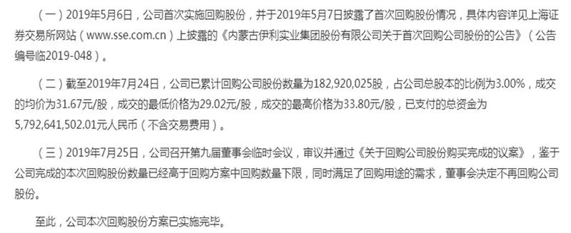 据查询,今年5月6日伊利股份首次实施回购。截至7月24日,公司已累计回购1.83亿股,占总股本3.00%,成交均价为31.67元/股,共支付57.93亿元。