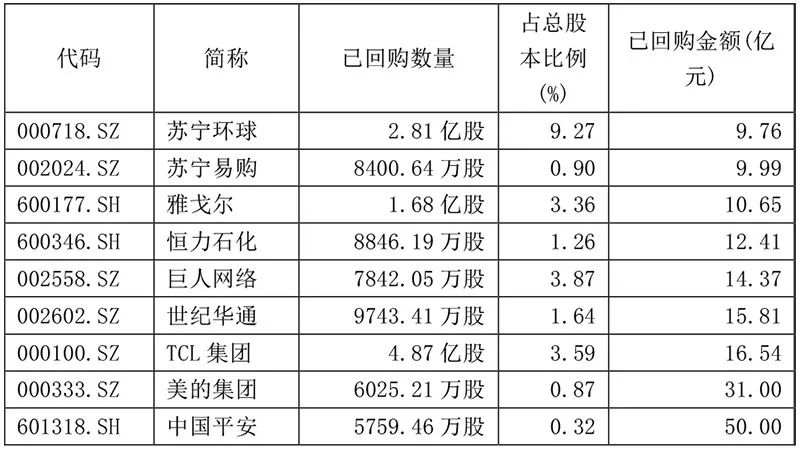 此外,苏宁环球、苏宁易购、雅戈尔、恒力石化、巨人网络、世纪华通、TCL集团等7家公司的回购额达到10亿元。