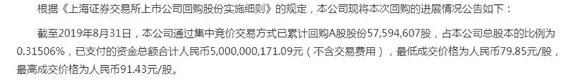 发布回购计划时其股价仅60元左右,但经过一系列流程后,完成股份回购所需动用的每股成本却提高了不少。据公告显示,其目前的回购成交价为79.85元/股至91.43元/股。