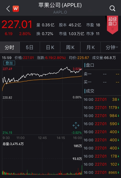 当地时间本周五(10月4日),苹果股价随大市高开高走,截至收盘上涨2.8%,报227.01美元,公司市值再度超过1万亿美元关口。