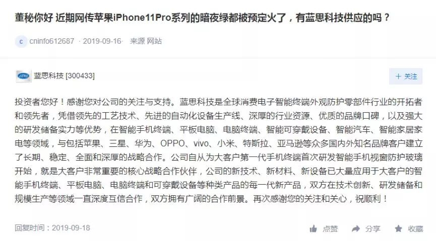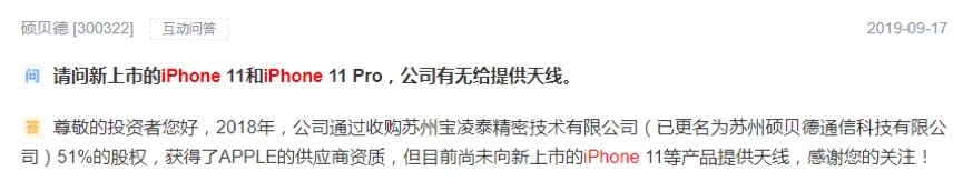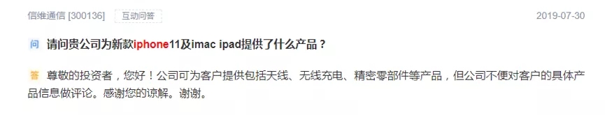 据中国证券报报道,自从iPhone11发布前后,就有投资者不断在互动易平台咨询蓝思科技、信维通信、欧菲光、鹏鼎控股、百邦科技等苹果产业链公司与iPhone11 系列的业务关系。