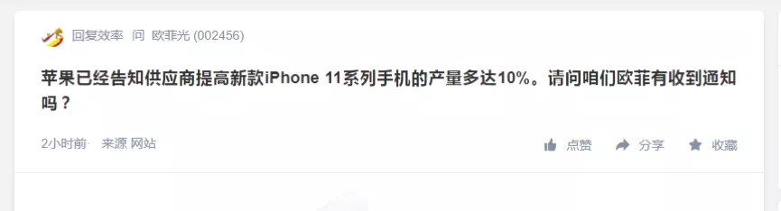 在A股市场,尽管目前处于假期休市期间,仍有投资者第一时间在互动平台紧跟这一行业热点。某投资者就咨询苹果供应商欧菲光,“苹果已经告知供应商提高新款iPhone 11系列手机的产量多达10%。请问欧菲光有收到通知吗?”