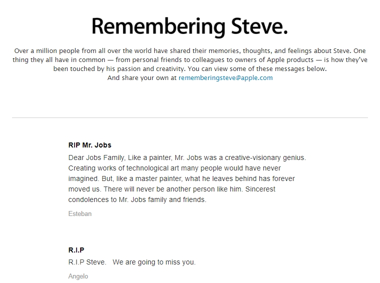 除了库克发推缅怀,苹果当天还在官网重新展示了“记住史蒂夫”页面,突出显示了来自世界各地“分享他们对史蒂夫的记忆,想法和感受”的人们提交的超过一百万份留言中的一些。