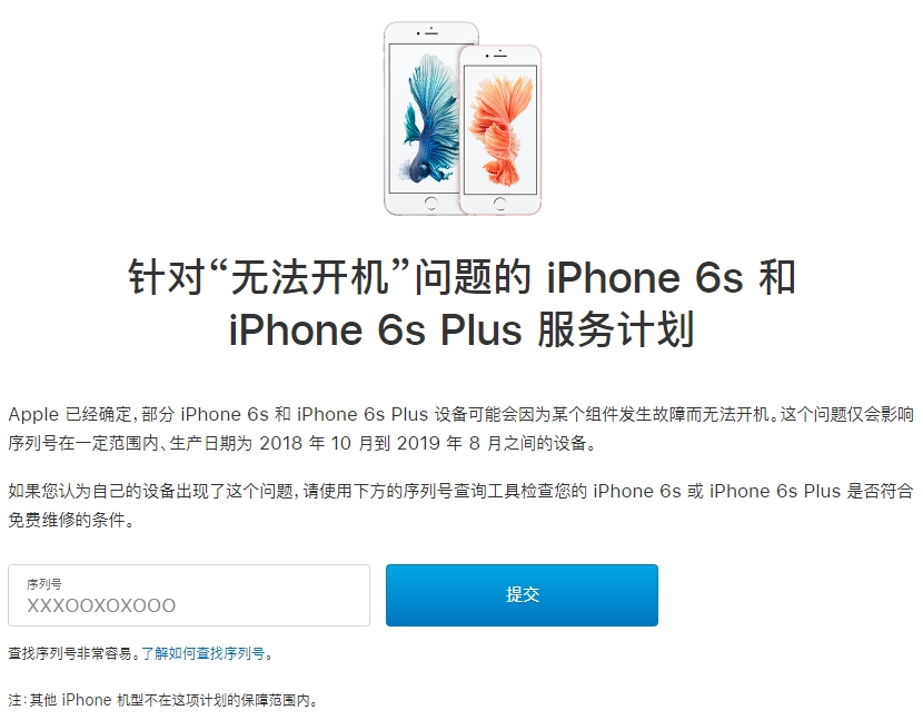 10月5日,苹果中文官网发布“服务计划”称,苹果方面已经确定:部分iPhone 6s和iPhone 6s Plus设备可能会因为某个组件发生故障而无法开机。这个问题仅会影响序列号在一定范围内、生产日期为2018年10月到2019年8月之间的设备。