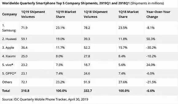 2019年一季度和2018年一季度手机厂商出货量及市场份额