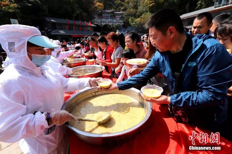 2018年10月1日当天,老君山中天门广场上的“一元午餐”摊点成为该景区最抢眼的“景观”,游客们排成长龙,等待开餐。