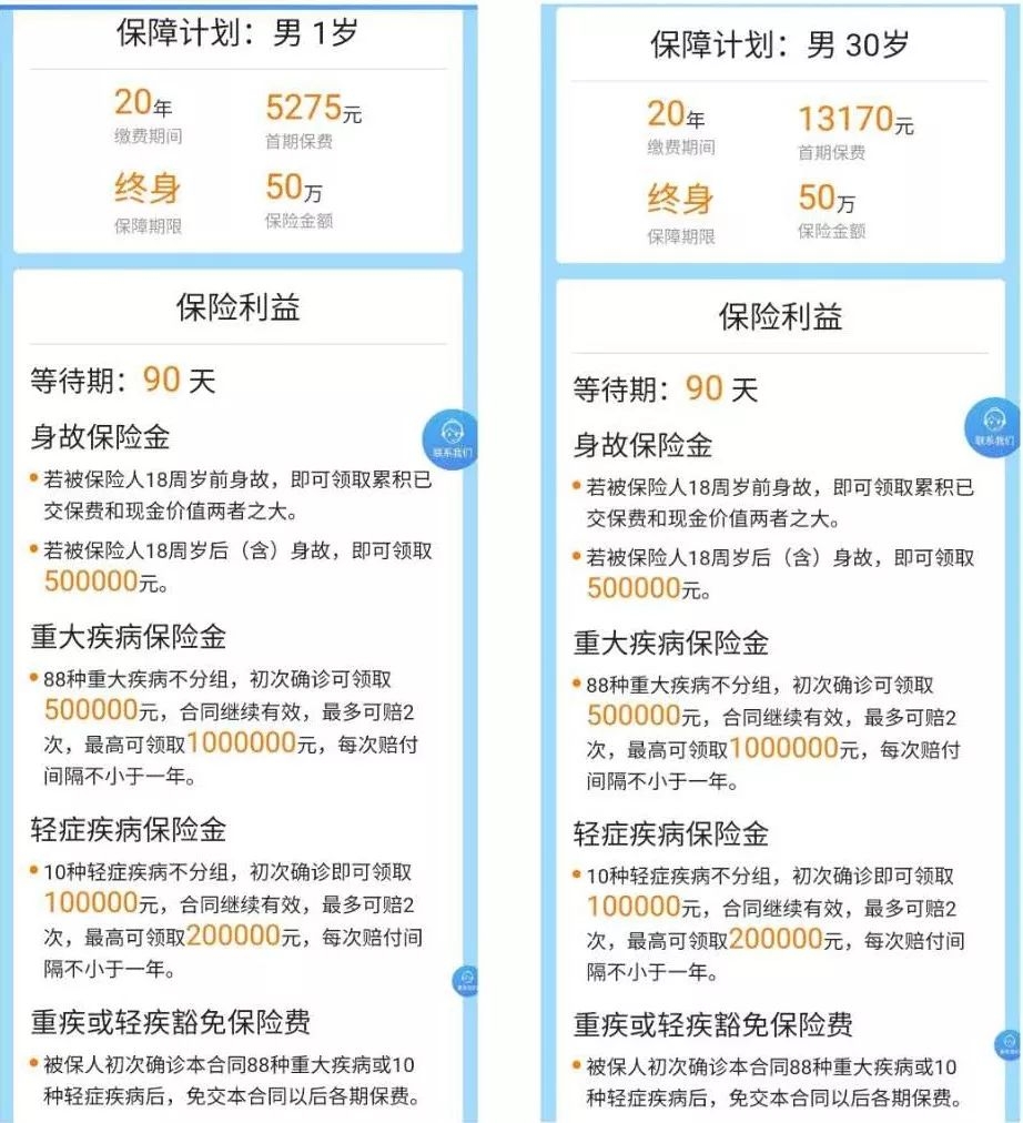 而且,对于预算不高的家庭来说,儿童还有一种产品可以选择:保30年甚至更短时间的“少儿定期重疾”。举个例子: