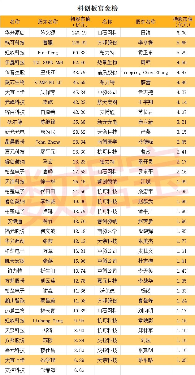 科创板富豪榜:华兴源创实控人持股市值140亿登顶科创板首富,69人持股市值过亿元,3家公司已缩水50%
