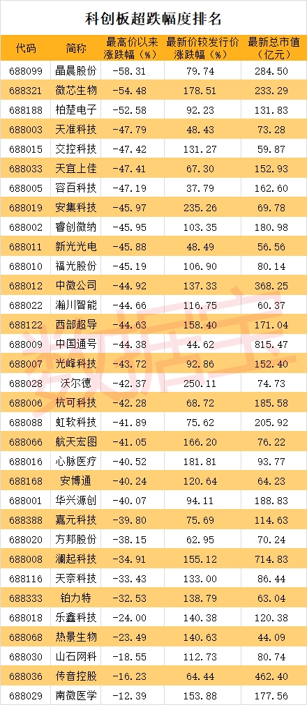 统计显示,已经有3家科创板公司最新价较历史高点下跌超过50%。其中,晶晨股份上市首日一度涨到166元,最新价仅69.2元,下跌超过58%位居首位。微芯生物上市首日一度涨至125元,现价仅56.9元,折价超过54%位居次席。柏楚电子上市首日一度涨至278元,现价不到132元,折价超过52%位居第三位。
