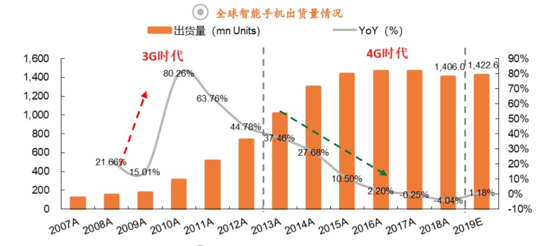 2016年-至今,智能手机增长乏力。随着全球市场上各类高性价比的手机不断涌现及消费者换机需求逐渐减弱,智能机市场已经逐渐饱和。