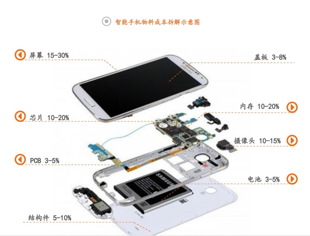 智能手机生产工序及不同企业按照自身技术水平承担的生产环节,智能手机产业链可分为上游、中游、下游三大部分:上游主要包括操作系统开发商、芯片开发商及元器件供应商;中游主要包括手机设计公司、智能手机生产企业等;下游以手机为主的品牌商。
