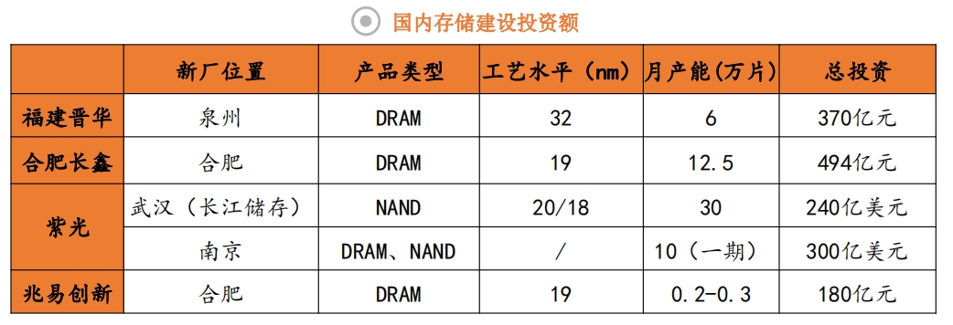 目前,国产DRAM投资以福建晋华和合肥长鑫两大阵营为主。其中,福建晋华的是32nm的DRAM利基型产品,主攻消费型电子市场;合肥长鑫的是19nmDRAM,主攻行动式内存产品。此外,长江存储和兆易创新也对DRAM进行了布局。