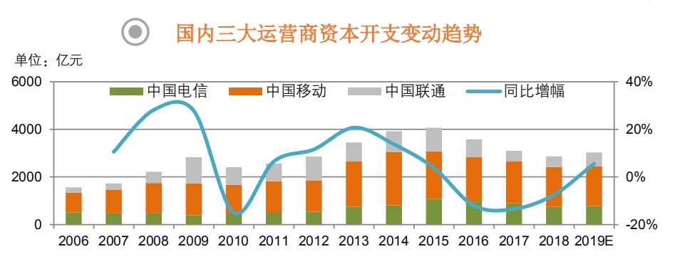 从3G到4G,目前消费者换机需求逐渐减弱,智能机市场已经逐渐饱和。随着移动通信技术的发展,5G通讯为射频器件行业带来新的增长机遇。国内5G牌照已于2019年6月发放,带动行业需求投资周期的启动。2019年三大运营商无线侧总开支计划为1396亿元,同比增长19%。