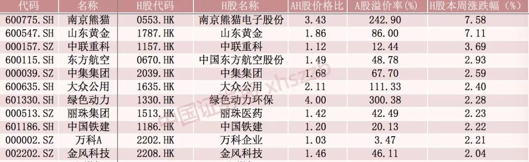 据Wind数据,本周沪深港通AH股溢价指数累计下跌1.22%,回落至130点下方。在114只含A股的H股中,南京熊猫、山东黄金H股的涨幅均超7%,包括中联重科、东方航空、中集集团在内的9只H股涨幅均超2%。