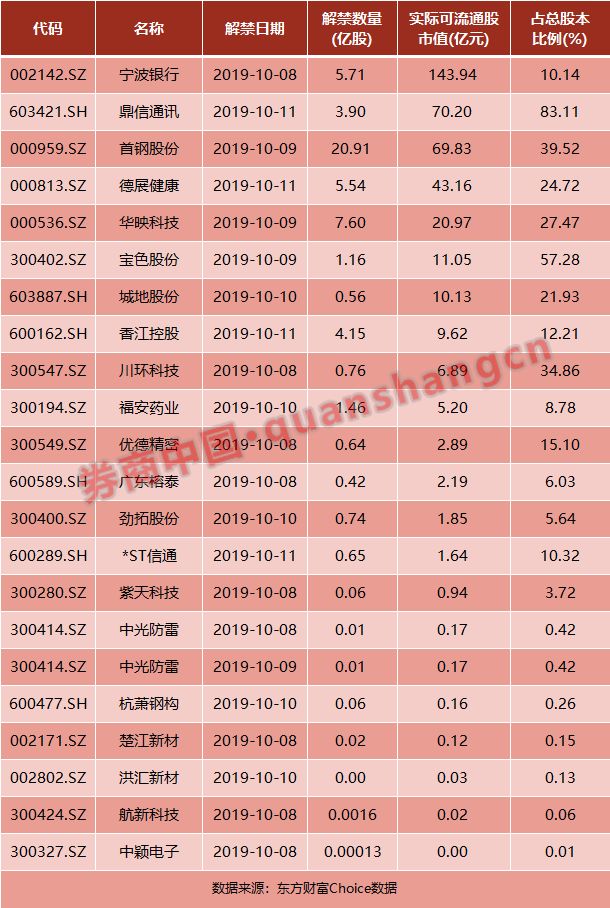从解禁市值来看,解禁市值居前三位的是:宁波银行(143.94亿元)、鼎信通讯(70.2亿元)、首钢股份(69.83亿元)。