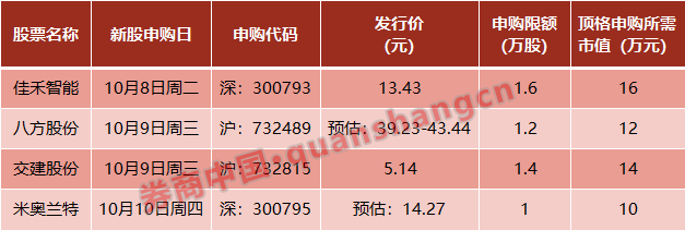 本周共有4只新股申购,分别是佳禾智能、八方股份、交建股份、米奥兰特,其中佳禾智能申购日期为周二(10月8日),米奥兰特申购日期为周四(10月10日),八方股份和交建股份申购日期均为周三(10月9日)。