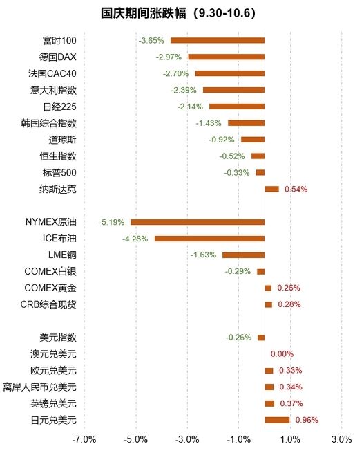 港股市场,恒生指数假期下跌1.04%(10.1-10.6),恒生国企指数下跌0.53%。(由于美股在A股收盘后的晚间交易,H股则基本和A股同步交易,所以美股等海外市场统计9.30-10.6,H股统计10.1-10.6)