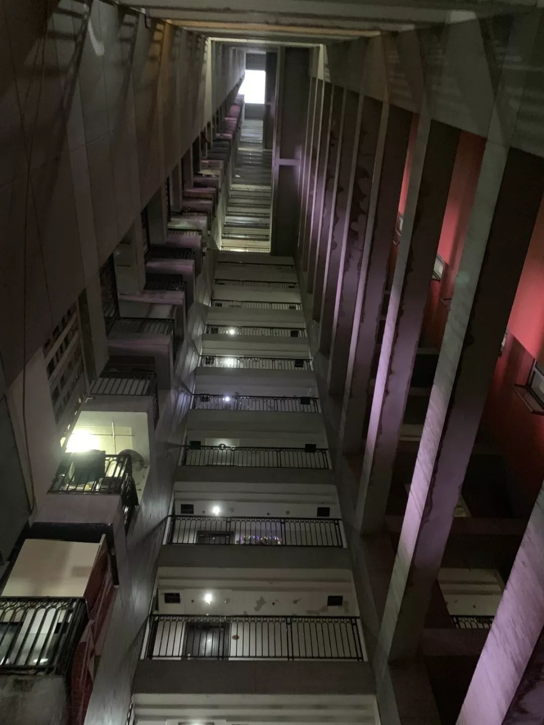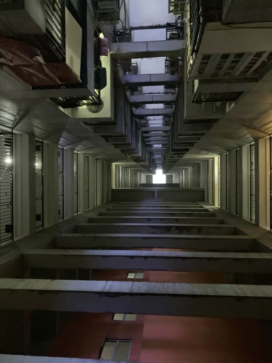 然而,红鼎国际的招牌设计另有所属。再往上,A座从9楼开始直冲霄汉的笔直天井,瞬间让眼前景象变得画风迷幻、飘渺起来。天井是魔楼的灵魂,内置阳台、栏杆密密匝匝,深邃的风洞把五颜六色的光束吸附糅合,油烟机声、音响的震颤、游客的嬉笑刺破尘霾,在147米的顶端汇集,发出嘤嘤的啾鸣,仿若喁喁啜泣。