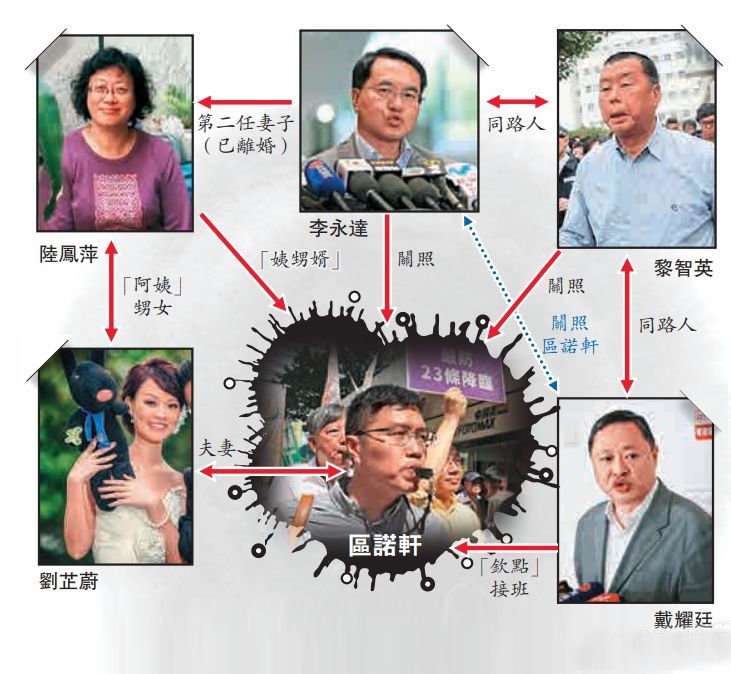 陆凤萍正是李永达的第二任妻子。遭弃后,陆凤萍投靠戴耀廷、黎智英等港独大佬的怀抱。其间,她很卖力地为区诺轩的政治前途“穿针引线”。