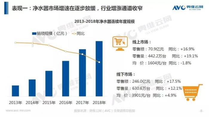 奥维云网(AVC)全渠道推总数据显示,2013年-2017年我国净水器市场规模基本保持每年30%以上增速扩容,2018年净水器全年销额规模316.9亿元,同比增长17.4%,较2017年增速下滑15.5个百分点。