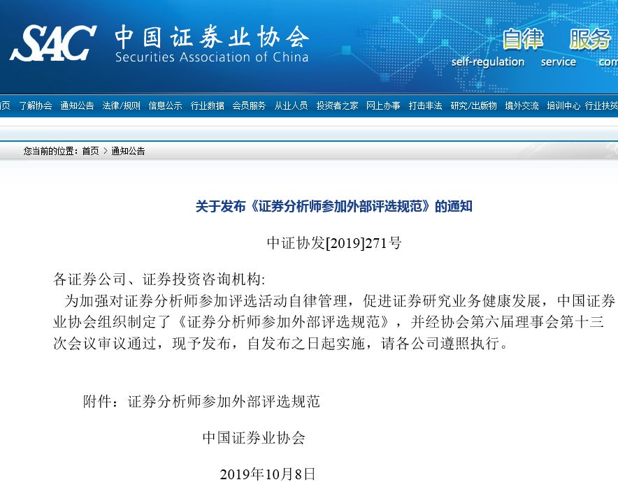 10月8日晚间,中国证券业协会官方网站发布了《证券分析师参加外部评选规范》的通知,通过21条详细规则,明文规范证券分析师参加各类外部评选活动。