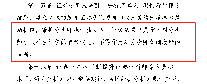 其中,上述《规范》重点强调,分析师外部评选参评结果不得与薪酬挂钩。