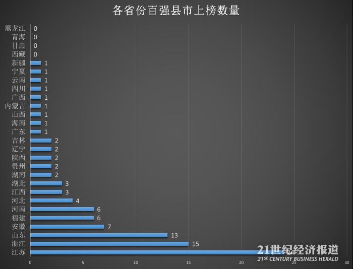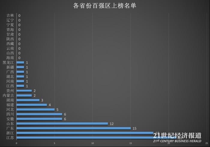 其中,江苏一省独占24个百强县市和21个百强区,稳居全国第一。浙江分别拥有15个和18个、山东拥有13个和12个、广东拥有1和15个、福建为6个和4个。