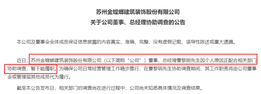 9日早间,苏州金螳螂公告称,公司的总经理曹黎明先生因个人原因正配合相关部门协助调查,暂不能履职。