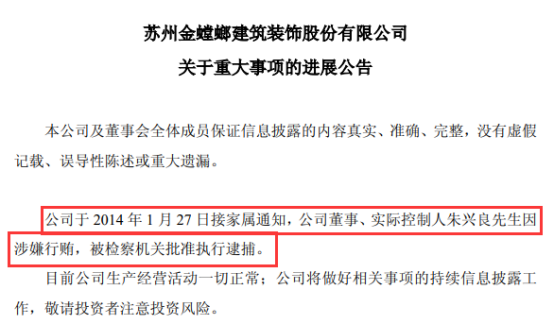 2014年1月27日晚,江苏金螳螂公司发公告表示,公司董事、实际控制人朱兴良因涉嫌行贿,被检察机关批准执行逮捕。