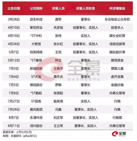 最初在今年的3月、4月,派生科技、葵花药业、*ST中科3家上市公司实控人纷纷出事,分别涉及非法吸收公众存款、故意杀人、黑社会犯罪,被捕。