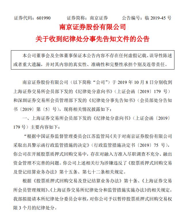 根据《股票质押式回购交易及登记结算业务办法》等文件的规定,对南京证券予以暂停股票质押式回购交易权限3个月的纪律处分。